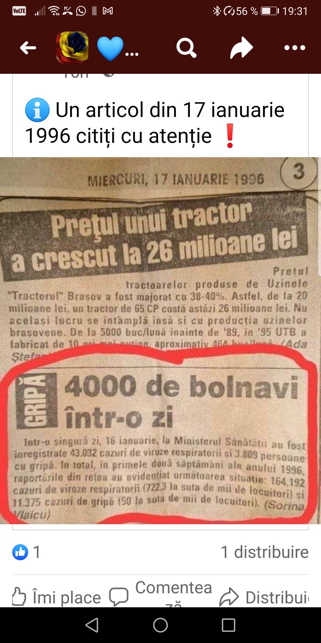 Constantin Lixandru Photo · 4 ani în urmă Screenshot_20211007_193119_com.facebook.katana Cititi cu aten??ie ce scrie in articol. 47.000 de noi cazuri de virozÄ? si gripÄ? ??ntr-o zi, 17 ian. 1996! Alex Vilvoi 4 ani în urmă Atunci nu mai era panică Robin'da Hood 4 ani în urmă Nu "vaccinul" a fost creat pentru plandemie ci plandemia a fost creată pentru a ne injecta și a ne dezumaniza cu ajutorul asa zisului "vaccin" anti covid19