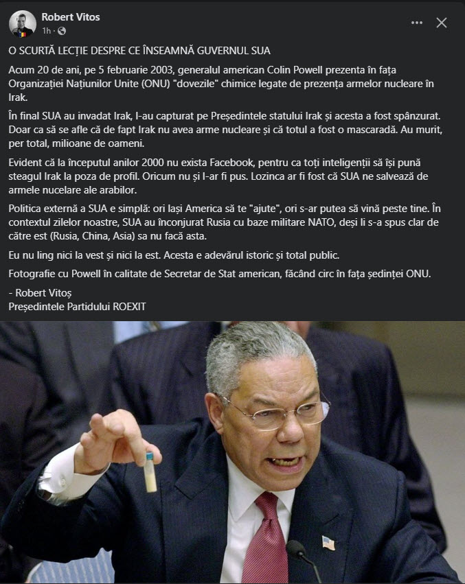 Acum 20 de ani, pe 5 februarie 2003, generalul american Colin Powell รฎn calitate de secretar de stat prezenta รฎn faลฃa Organizaศiei Naศiunilor Unite sticluศa cu ,,dovada" deศinerii de cฤtre Irak a armelor de distrugere รฎn masฤ