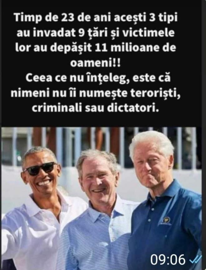 รn final SUA au invadat ศi devastat Irakul, l-au capturat pe Saddam Hussein ลi l-au spรขnzurat. Doar ca sฤ se afle cฤ de fapt Irakul nu avea arme chimice ศi cฤ totul a fost o mascaradฤ care a dus la moartea a milioane de oameni.