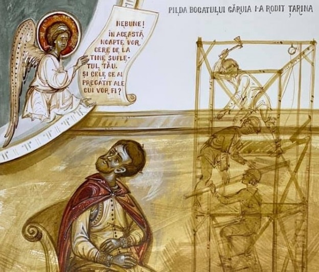 Să observăm că nu întâlnind vreun bogat a rostit Mântuitorul pilda bogatului căruia i-a rodit țarina, ci după discuția cu un om simplu („cineva din mulțime”), care-i ceruse ajutorul la împărțirea unei moșteniri între el și fratele său. Și ce mare moștenire putea să aibă acel gură-cască? Era vorba poate de o casă, poate de o bucată de pământ, lucruri pentru care se ceartă de obicei frații după ce-și duc părinții la groapă. Să nu ne mirăm că în mințile multor săraci se găsesc gândurile bogaților. Săracul care gândește cu gândurile bogatului e doar un bogat căruia nu i-a rodit încă țarina. Limita dintre bogăție și sărăcie este destul de fluidă în conștiința oamenilor, dar întotdeauna în jos: nimeni nu se consideră bogat atâta vreme cât există alții mai bogați cu care să se compare. Așa se face că nu doar săracii gândesc cu gândurile bogaților, dar și bogații gândesc la fel de des cu gândurile săracilor. Nu este nimic nou în gândurile oamenilor despre îmbogățire: toate se trag din reflexele ancestrale ale omului, iar cel mai puternic dintre toate este acesta: frica de moarte. Pr. Ioan Florin Florescu