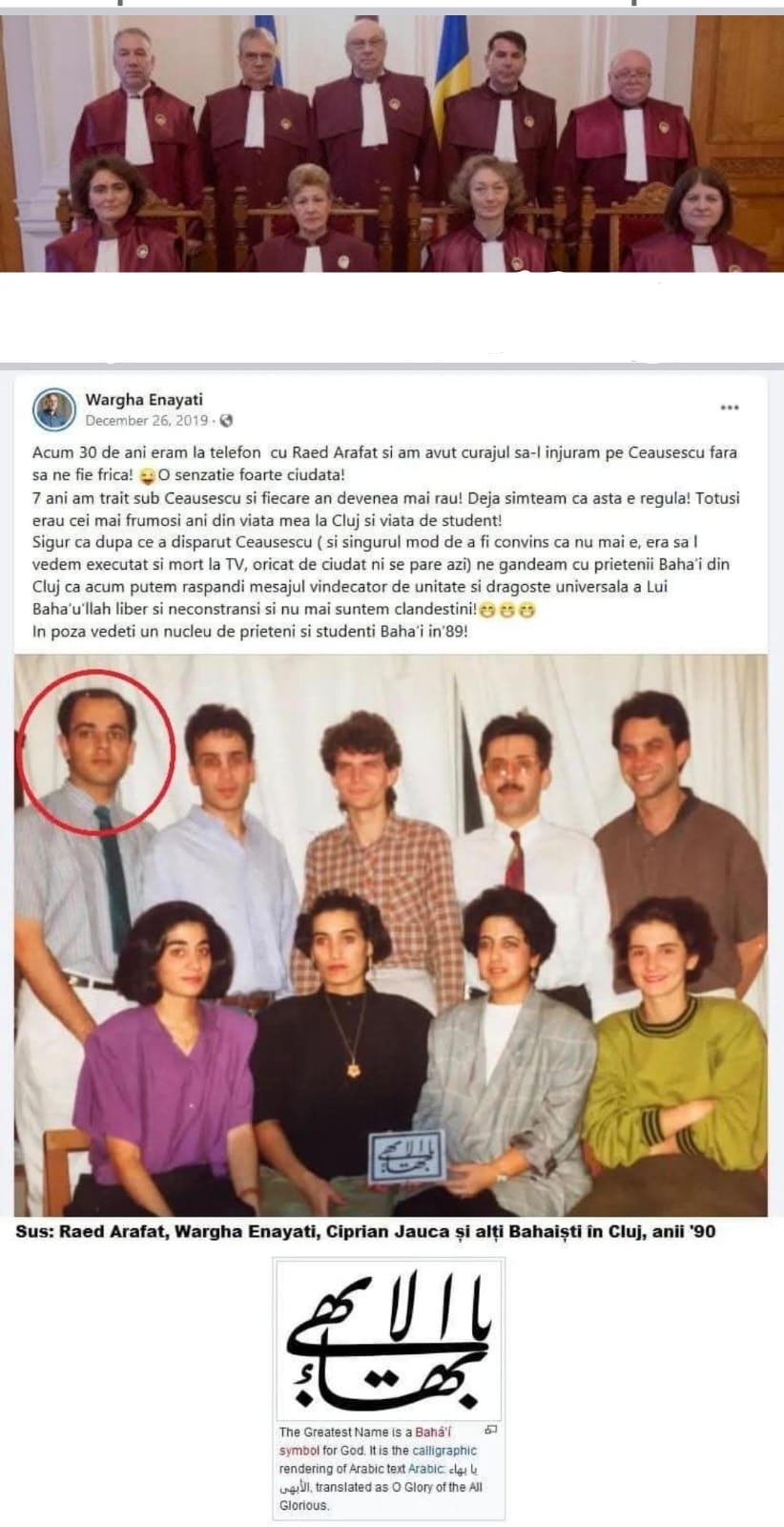 Liderul religiei Baha'i din România este doctorul Wargha Enayati, fondatorul rețelei medicale Regina Maria. În ziua producerii eclipsei de Soare din 26 decembrie 2019, sub pretextul împlinirii a 30 de ani de la asasinarea soților Ceaușescu, acesta posta pe Facebook o fotografie a unui grup de 9 membri Baha'i din anul 1989, în care se afla și comandantul acțiunii din timpul pandemiei covid-19 - Raed Arafat. În poză sunt 9 membri, pentru că 9 e un număr simbolic Baha'i (la fel ca și numerele 5, 18 și 19) prezent în structura de organizare a Instituțiilor pe care Baha'ii le conduc. Astfel, Casa Universală a Dreptății (instituția lor supremă), e condusă de un consiliu format din 9 membri, existând multe alte structuri instituționale din diverse domenii din spatele cărora influența numărului 9 se face simțită. Cei 9 judecători ai CCR sunt un exemplu, iar decizia acestora de a vota în unanimitate anularea alegerilor prezidențiale (greu de înțeles pentru cei mai mulți dintre oameni), poate fi înțeleasă tocmai în cheia semnificației simbolice a numărului 9.