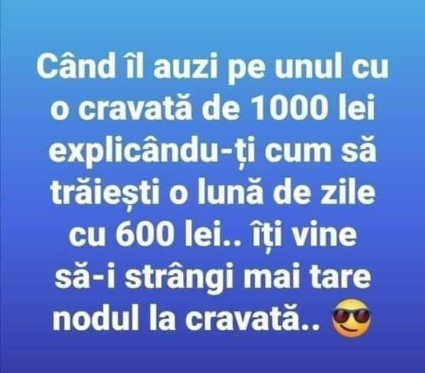 Morala Zen Un cal deprimat stătea tolănit şi nu mai vrea pentru nimic în lume să se ridice. Stăpânul disperat chemă veterinarul. - Aaaa, e foarte grav, singura soluţie sunt aceste pastile pe care i le vei da câteva zile; dacă nu reacţionează, trebuie eutanasiat. Porcul auzi totul şi fuge la cal: - Ridică-te, altfel se sfârşeşte rău !!! Dar calul nu reacţionează şi dă încăpăţânat din cap. A doua zi, veterinarul vine să vadă efectul pilulelor: - Nu reacţionează, mai aşteptăm o zi, dar cred că nu sunt speranţe ! Porcul fuge din nou la cal: - Trebuie să te scoli, altfel vei păţi mari necazuri ! Calul, nimc ! A treia zi, constatând lipsa progreselor, veterinarul îi cere stăpânului: - Du-te după carabină, a venit timpul să-l scăpam pe bietul animal de chinuri ! Porcul fuge disperat la cal: - Trebuie sa reacţionezi, e ultima ocazie, te rog, aştia sunt gata să te omoare !!! Calul se ridică, se scutură, face câteva mişcari de dans, o ia la fugă în galop şi sare câteva obstacole. Stăpânul, care ţinea mult la calul său,foarte fericit îi spune veterinarului: - Mulţumesc mult, eşti un medic minunat, ai facut un miracol !!! Trebuie neapărat să sărbătorim evenimentul! Haide să tăiem porcul şi să facem o masă mare!!! Morala Zen: Vezi-ţi mereu de treburile tale!??????
